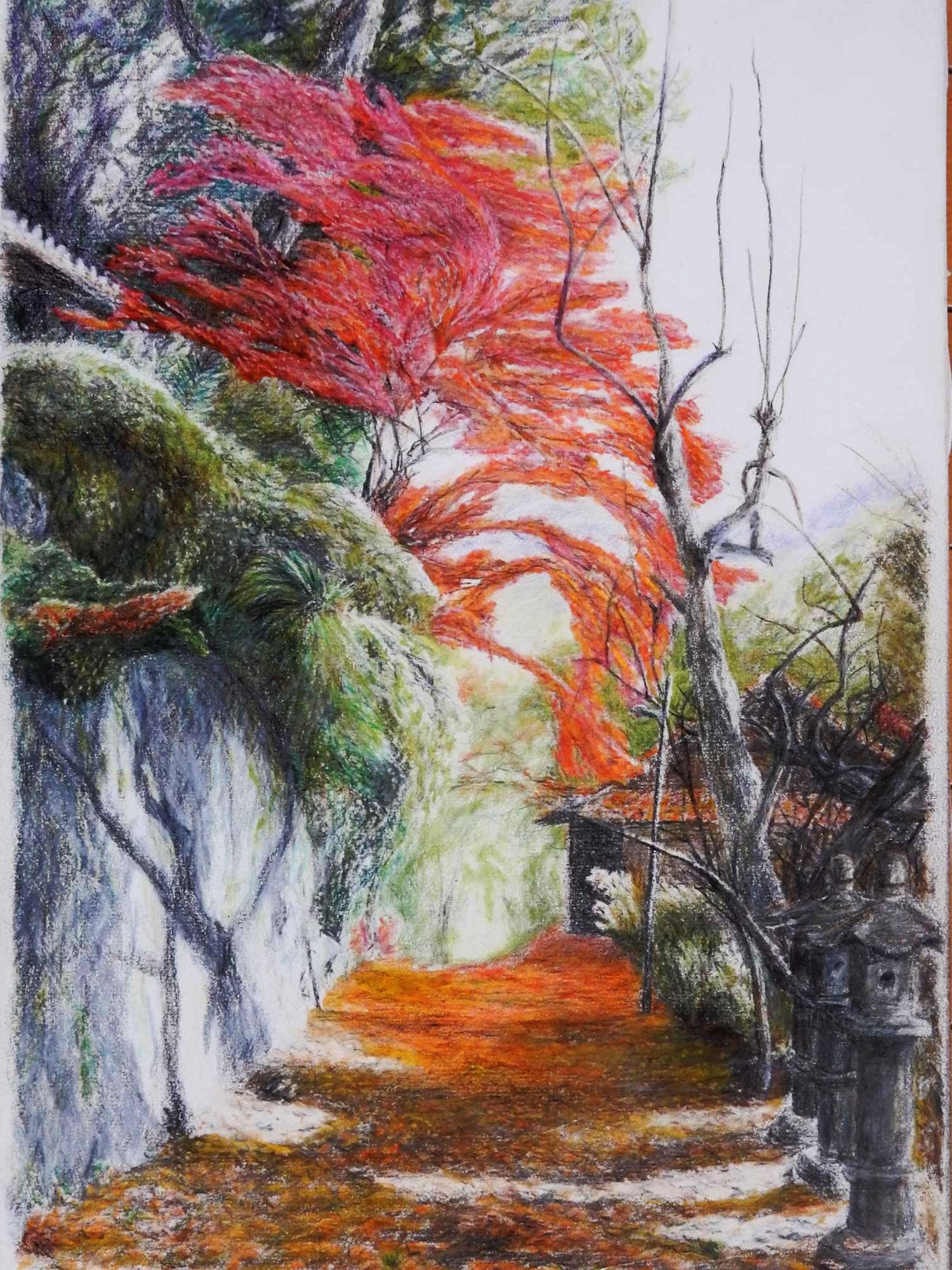 紅葉を描くのが難しく、なんどもやり直しましたが今回400円の良い紙を使ったので破れることなく出来上がりました。