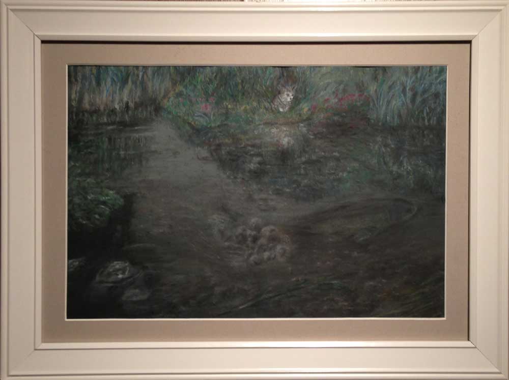 背景に金魚を狙っている猫を描こうか、それとも水中に漂う壷をイメージせいた水草などを描こうかあれこれ思いを馳せながら停滞しています。